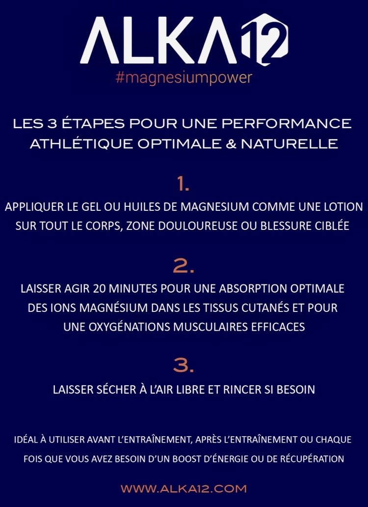 Le véritable entraînement commence avant et après l' effort athletique donc appliquer ALKA12™ a ce moment là. Avant, Il remédie pour plus d'énergie, soulage les tensions musculaires et les crampes, réduit le risque de blessure et améliore l'endurance sportive. Aprés, il vous permet d’apprecier une récupération ultra rapide et un sommeil profond. Les produits de magnésium ALKA12™ sont appliqués directement sur la peau, comme une lotion, où ils sont absorbés. Vous pouvez appliquer les produits ALKA12™ sur tout le corps ou porter une attention particulière à toute zone douloureuse ou à des blessures spécifiques. Laisser agir au moins 20 minutes, ce qui est nécessaire pour une absorption optimale des ions magnésium dans le tissu cutané et des oxygénations musculaires efficaces. Laissez le produit sécher à l'air libre pour de meilleurs résultats. Ensuite, rincez pour éliminer les résidus de sel laissés sur votre corps. Vous pouvez faire deux applications par jour au maximum car la peau n'absorbe que ce dont le corps a besoin. Il n'y a pas d'effets secondaires néfastes, contrairement aux suppléments oraux de magnésium.
